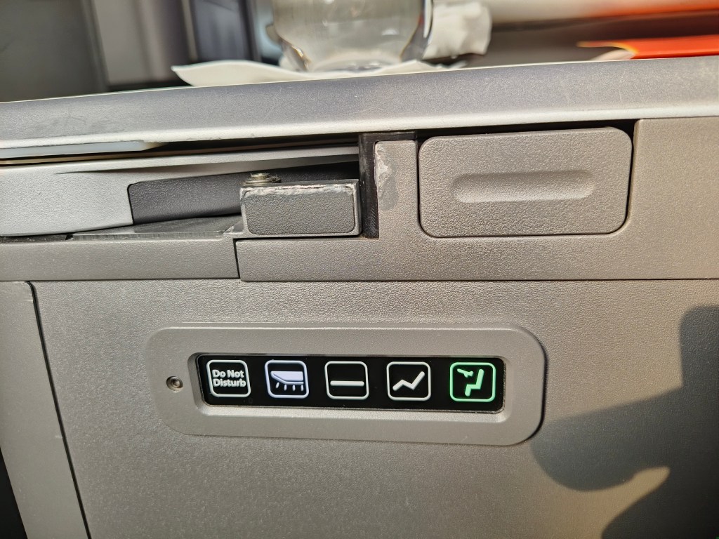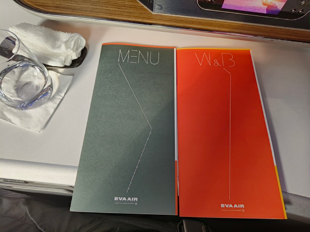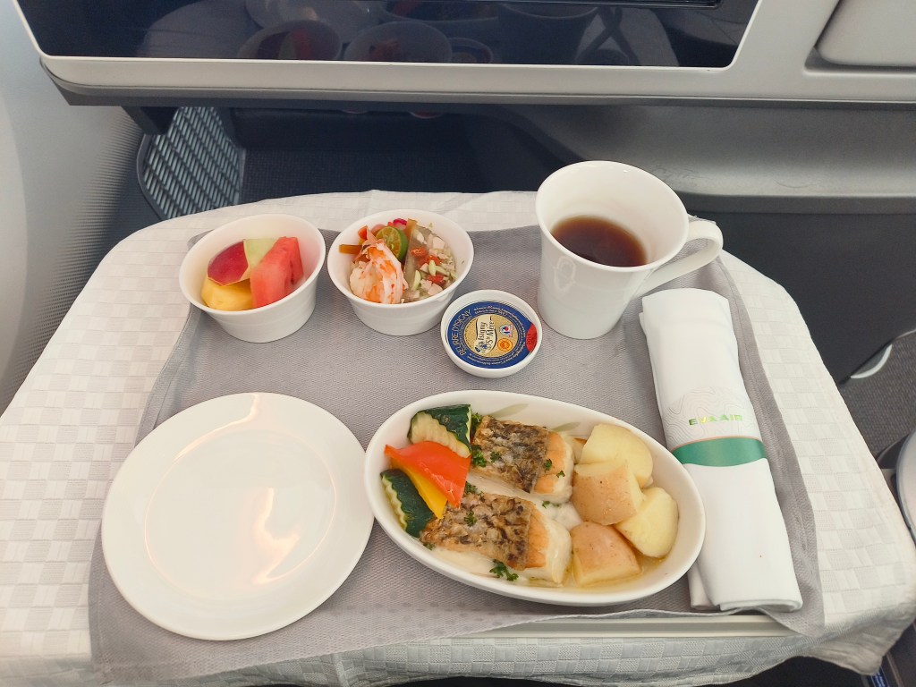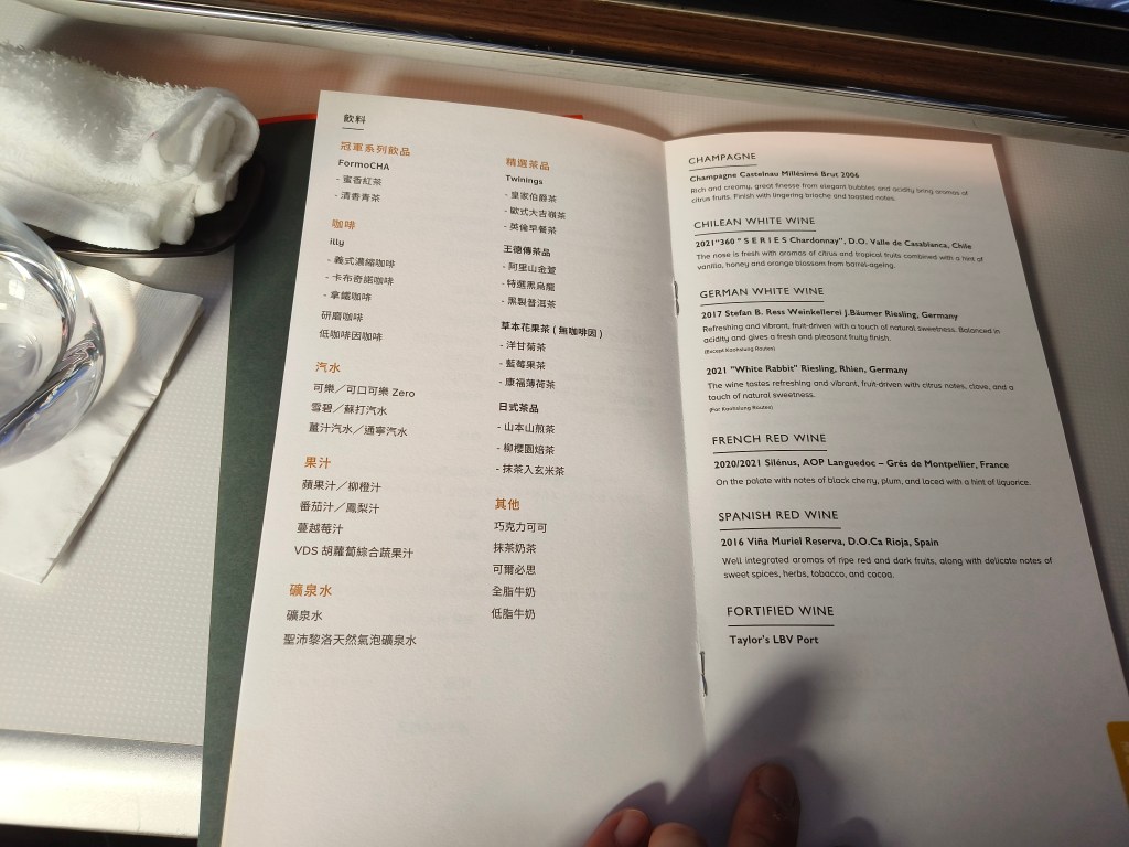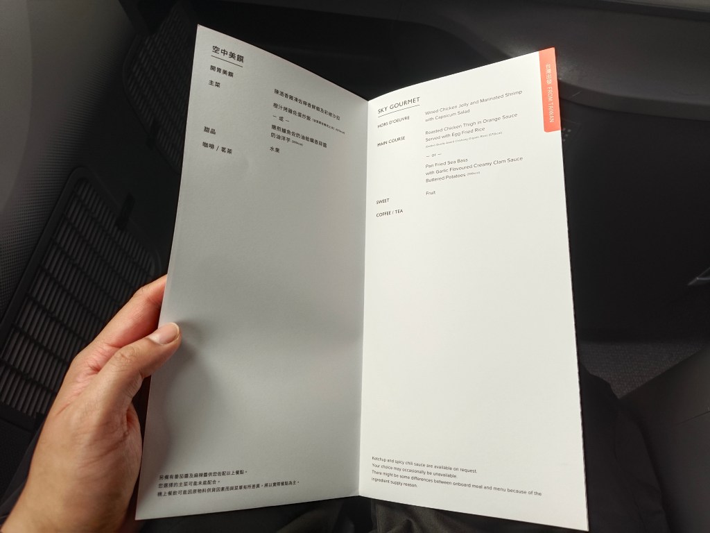 咁我係屬於皇璽桂冠艙旅客當然係第一類登機,上咗飛機之後就搵到自己預訂嘅2A座位,空服員第一時間就畀咗杯水同熱毛巾我。因為我冇預先係online check in嗰陣揀定餐,所以同時間亦都問我想食乜嘢主菜,我揀咗魚餐,因為喺台灣除咗喺宜蘭嗰日有食過海鮮之外連續幾日都係食雞豬牛,食到已經有少少口淡淡🤣🤣。