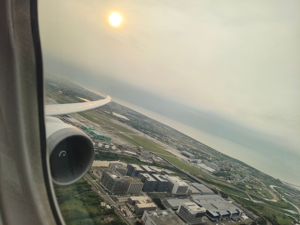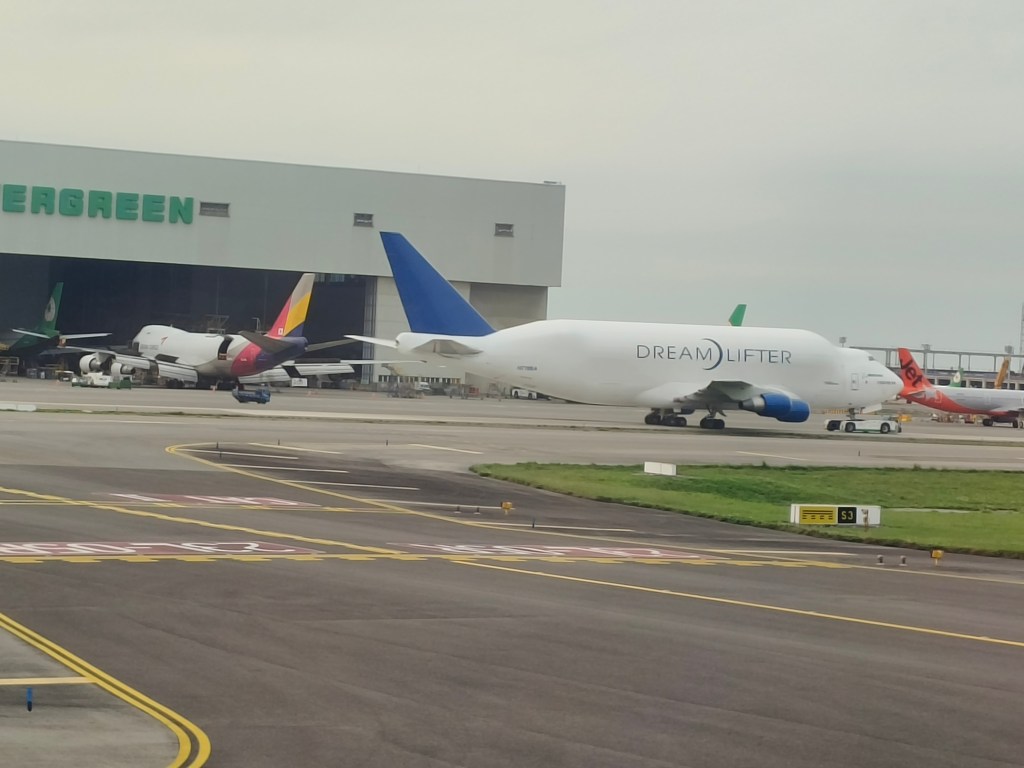 飛機準時出發,最估唔到嘅係喺臨起飛之前竟然喺跑道度見到波音嘅 Dreamlifter 飛機喺出面滑行道,畀拖機拖行緊。有唔少航空發燒友多日咁喺桃園機場守候住呢一架機,希望影到佢嘅一面。