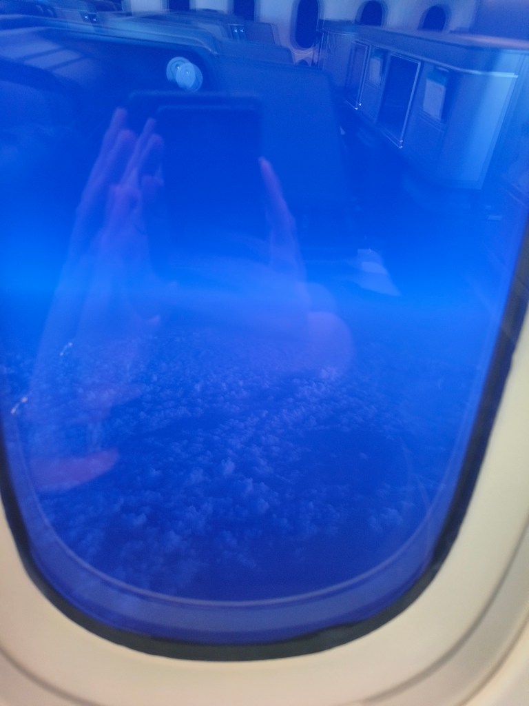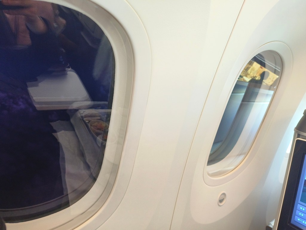 波音787最有特色嘅變色舷窗,利用電致色變功能調校光暗,將佢撳到最強可以好有效咁遮擋住太陽嘅照射,但依然可以睇到窗外嘅景觀。