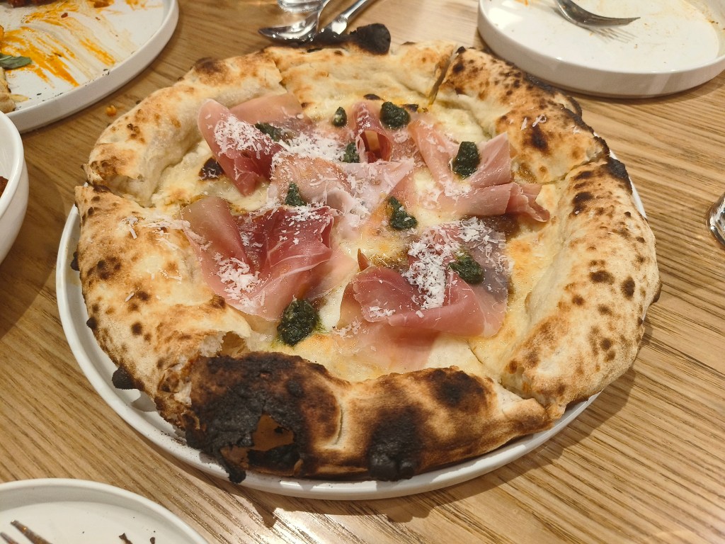 跟住就嚟第二個pizza – Living the dream,呢一個pizza上面有parma ham,仲有芝士羅勒葉,而且呢一個pizza嗰邊位畀上一個燒到有少少燶,食落口嘅香味更加豐富。入口食到酸種餅底獨特嘅香味仲有parma ham嘅鹹味,基本上你食一片係完全唔夠喉,要食多一片先夠滿足感(邪惡感)。